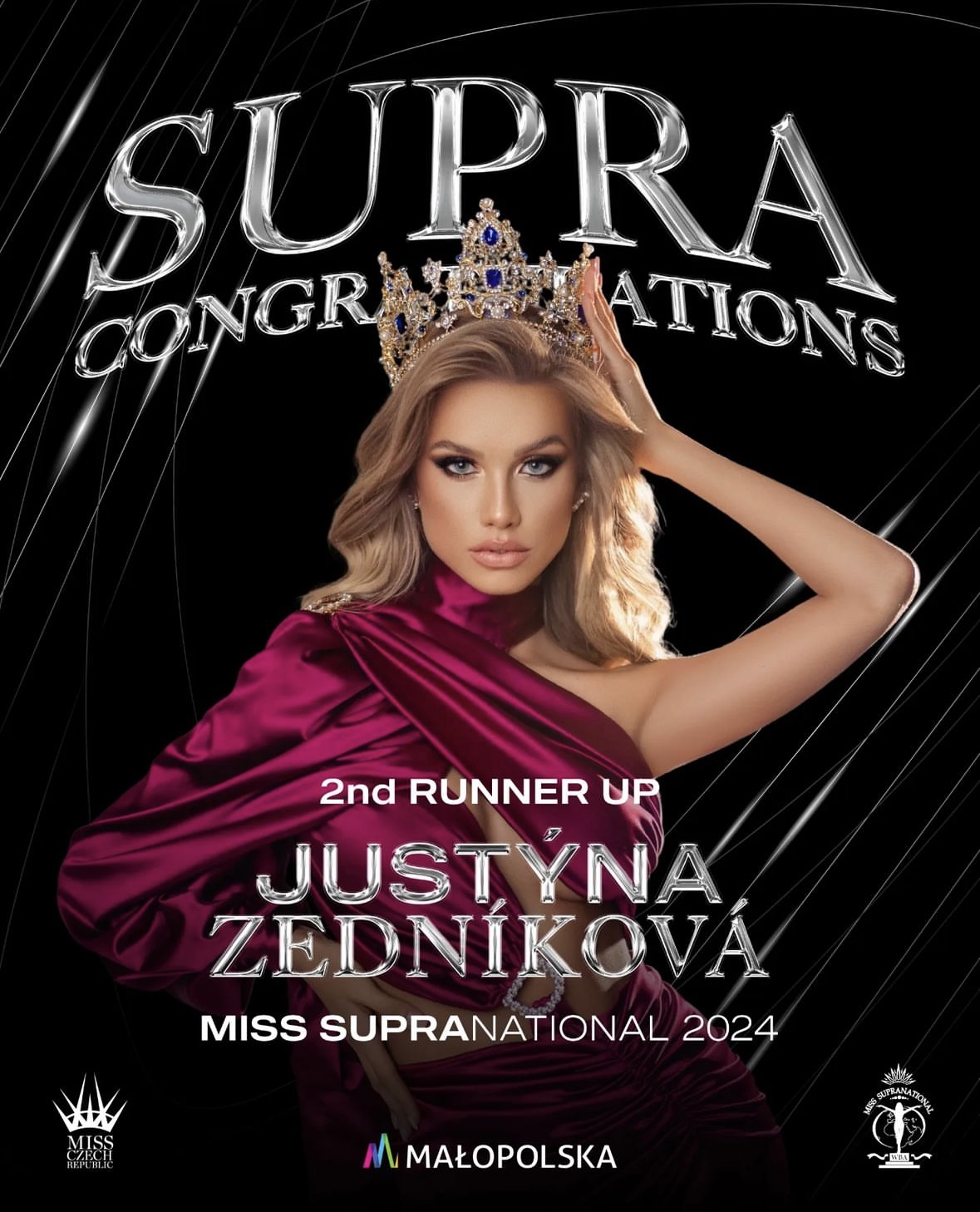 Na světové soutěži byla po celou dobu skvělá a ukázala, že Česká republika má světu co nabídnout. Justýnka ze světové soutěže odváží titul Miss Supranational 2nd runner up, tedy 3. místo z výběru dívek celého světa.